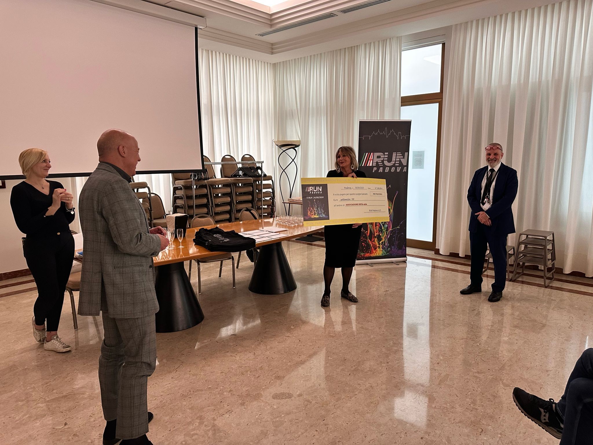 Giovedì 10 aprile scorso all'hotel Antoniano di Montegrotto Terme, alla presenza degli sponsor, dei Sindaci di Montegrotto Terme e Abano Terme c'è stata la consegna ufficiale dell'assegno di € 7.000 da parte del team di V-RUN PADOVA a sostegno dei progetti di Associazione Sofia Onlus.