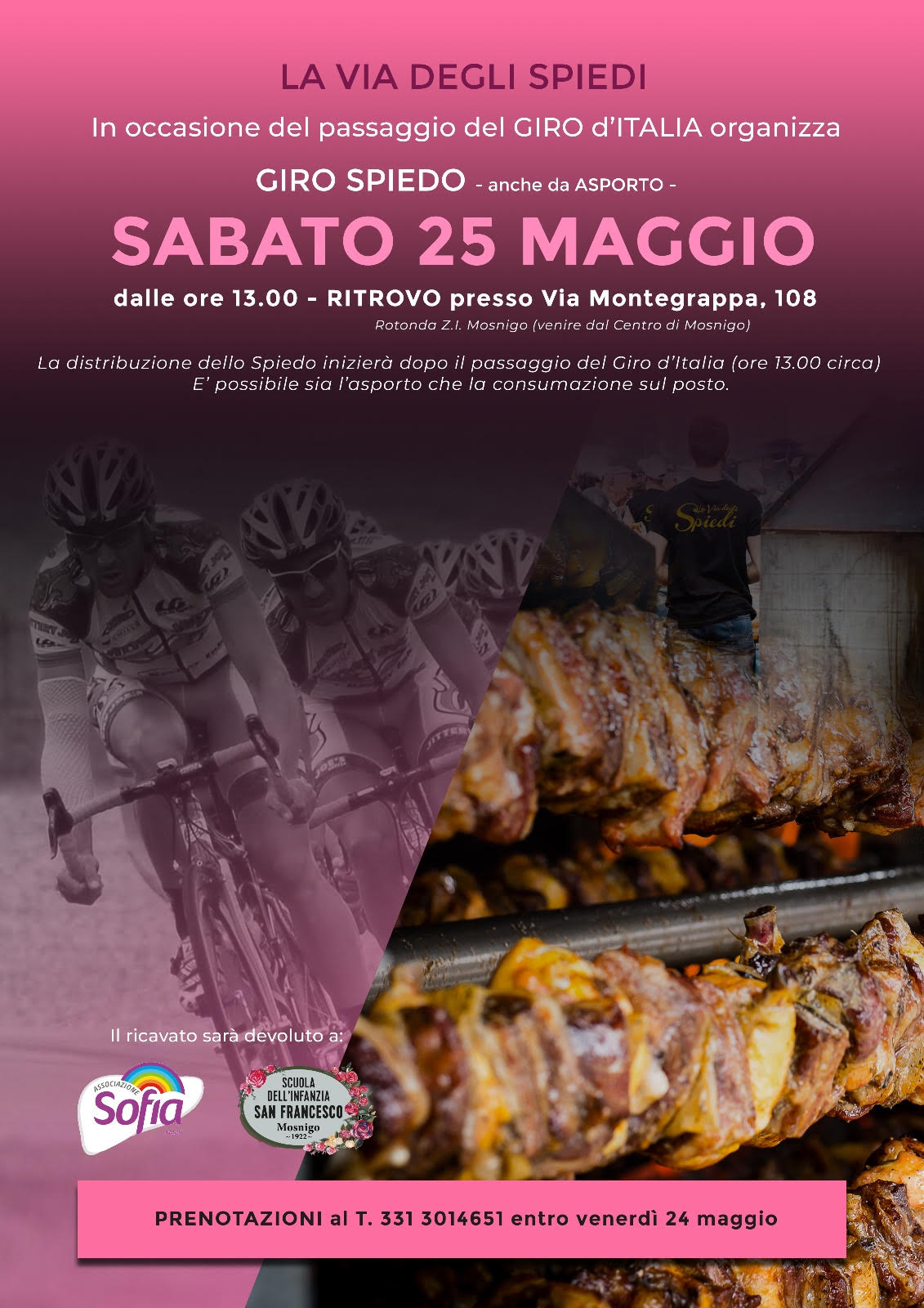 In occasione del passaggio del Giro d'Italia, vi aspettiamo sabato 25 maggio a Mosnigo in Via Montegrappa 108 per il GIRO SPIEDO. La distribuzione dello spiedo inizieràdopo il passaggio del Giro d'Italia (ore 13.00 circa).