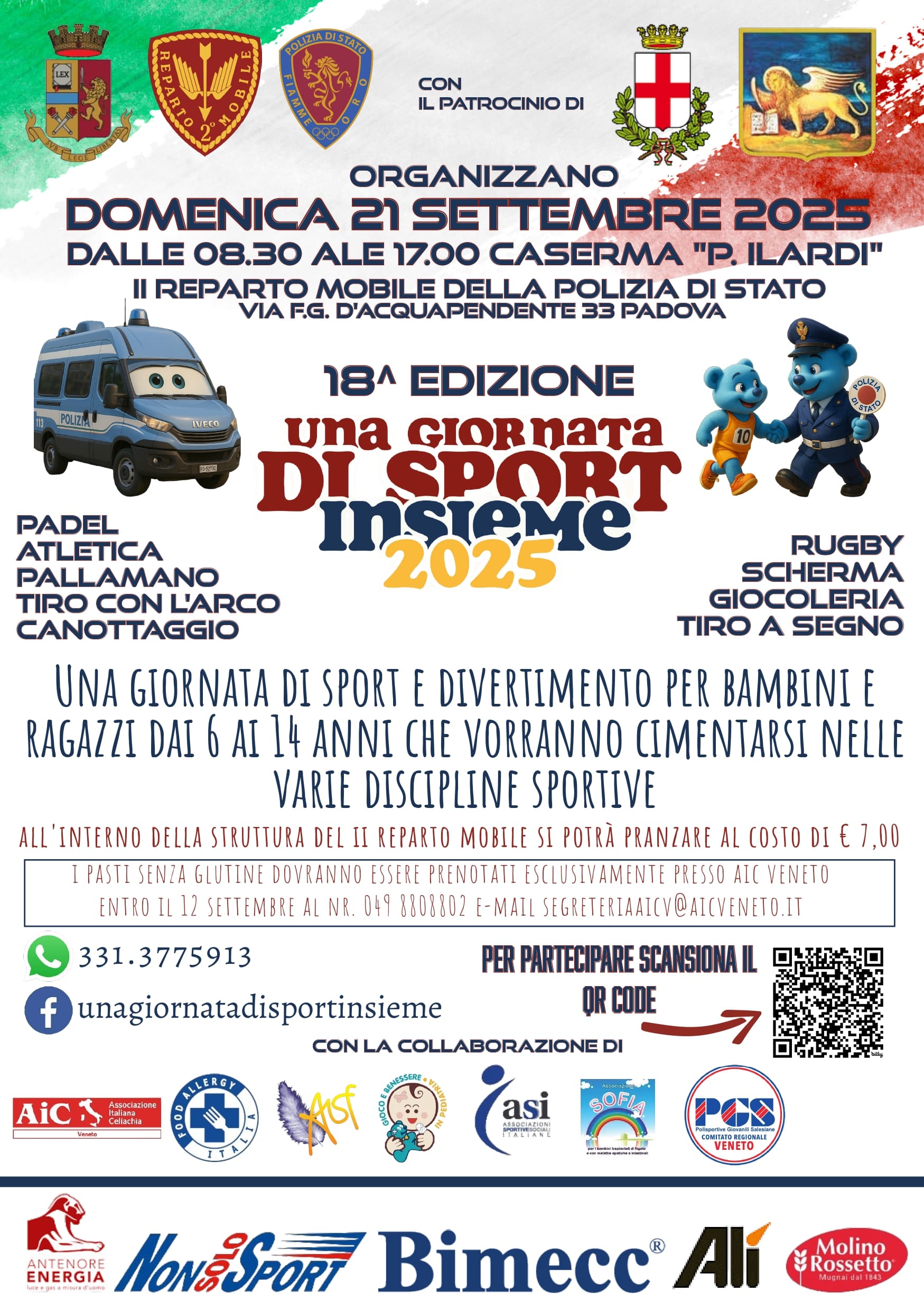 DOMENICA 21 SETTEMBRE 2025 Siamo lieti di invitarvi alla diciottesima edizione di "UNA GIORNATA DI SPORT INSIEME", organizzata dal 2° Reparto Mobile della Polizia di Stato, in Via F. G. D'Acquapendente 33, Padova.